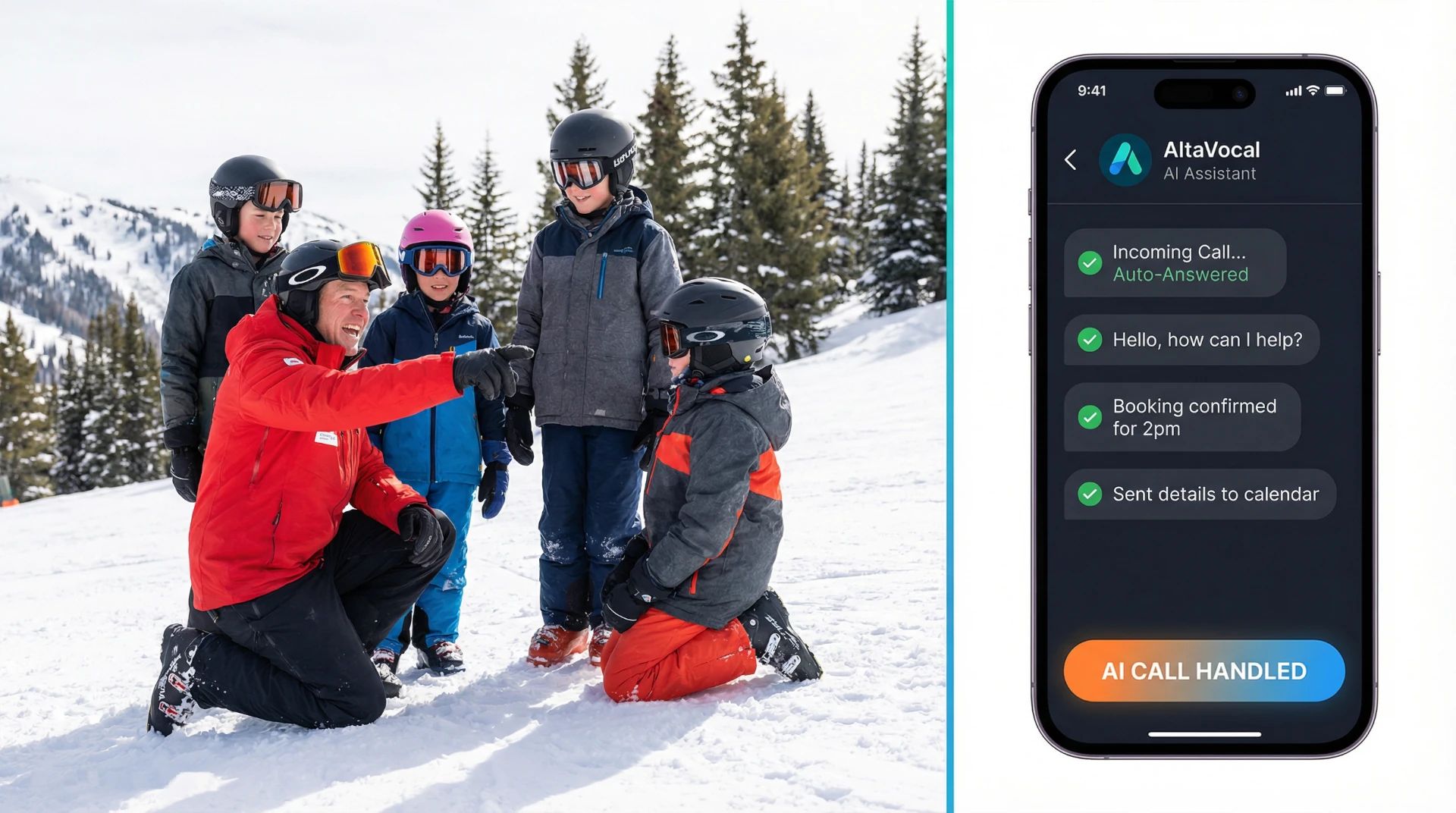 Call our demo line and experience exactly how AlpineCalls works. The AI agent will greet you like it's your own AI receptionist, qualify your interest, and book a demo ski lesson.